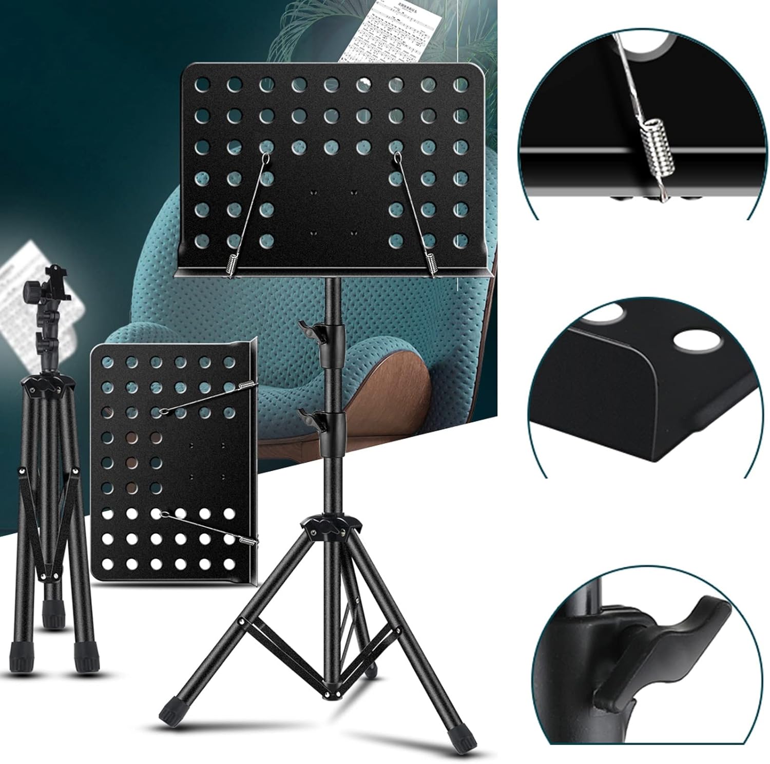 Name: Convenient Folding Music StandMaterial: Iron/MetalProcess: paint frostedColour: Black Size: 1.8mFeatures: The side screw knob is stable and does not fall offApplicable: Carrying out, playing at home, suitable for concerts, churches, schools, orchestra performancesThe package includes:1x music stand1x sheet music bag