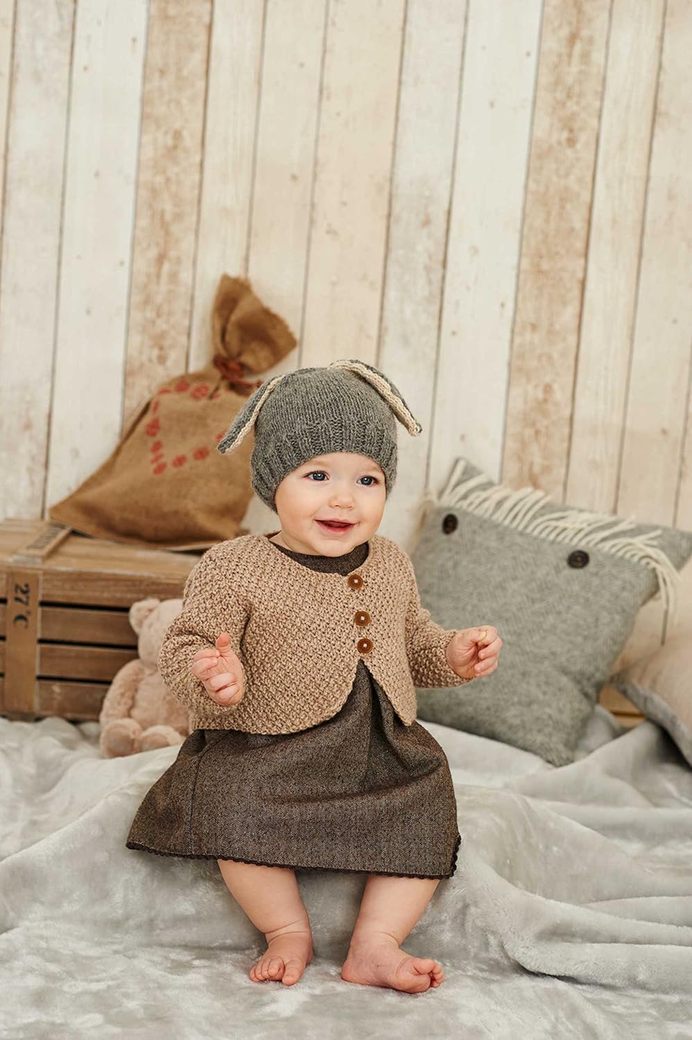 This King Cole Baby Book Six booklet instructs you how to knit baby garments from birth to 7 yrs over 62 pages, complete with colourful illustrations throughout. Each design can be made using double knitting wool.The garments should be knitted up using Stitch Holders, 1 Pair 3.25mm (UK10 USA3) 1 Pair 4mm (UK8 USA6) 1 Pair 5.5mm (UK5 USA9) knitting needles unless otherwise stated. The garments this knitting book instructs you how to knit are as follows: Little Woodland double breasted coat in red with long sleeves, Little Garden double breasted coat in white with long sleeves, Willow Coat in green, double breasted with collar, Little Mandarin double breasted coat in purple.Little Owl jersey in green with owl design on the front and ribbed edges, Little Owl hoodie in fawn with owl design on the front, Little Owl hat in rust with tassle detail and owl eyes.Little Walking jacket in sage with hood with ears and ribbed edges, Little Boating jacket in green with collar, ribbed edges and cable knit detail.Little Purl hat in pink and white, Little Cub hat in brown with ears, Funny Bunny hat in grey with floppy bunny ears and ribbed detail.Little Star hat in blue with red star detail, Little Star blanket in blue, red and beige with star detail and ribbed edge, Little Star hoodie in grey and oatmeal with ribbed detailing. Foxy hat in brown and beige with fox ears and face detail, Little Snowflake blanket in red and cream with ribbed edge and snowflake design.Little Holiday blanket in pink, Little Holiday jacket in blue, Little Holiday cardie in pink.Little Crocus dress in yellow and white with cable knit and pleat detail, Rosehip Tunic in rust with cable knit and pleated detail.Sunny Little cardie in red with short sleeves.Little Heart jersey in pink and white with ribbed detail.Little Sailor hoodie in red, blue and oatmeal