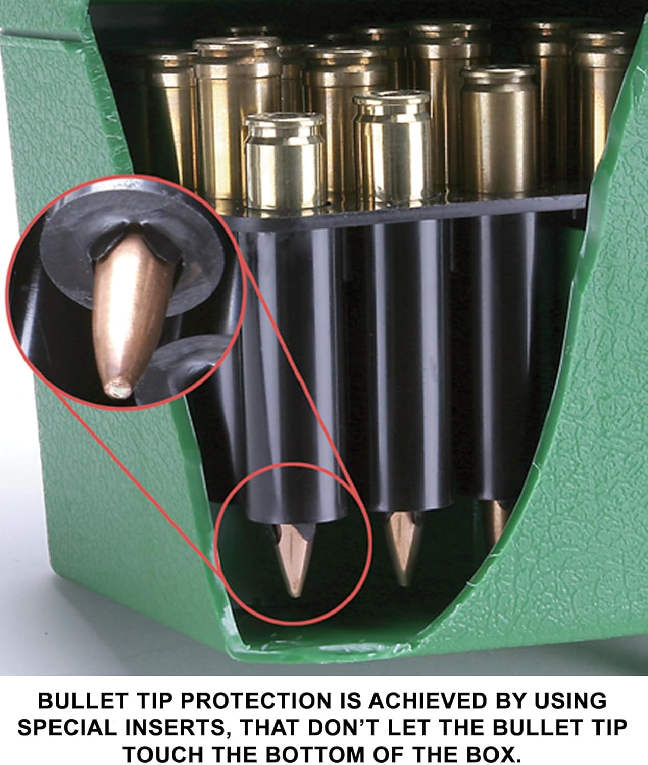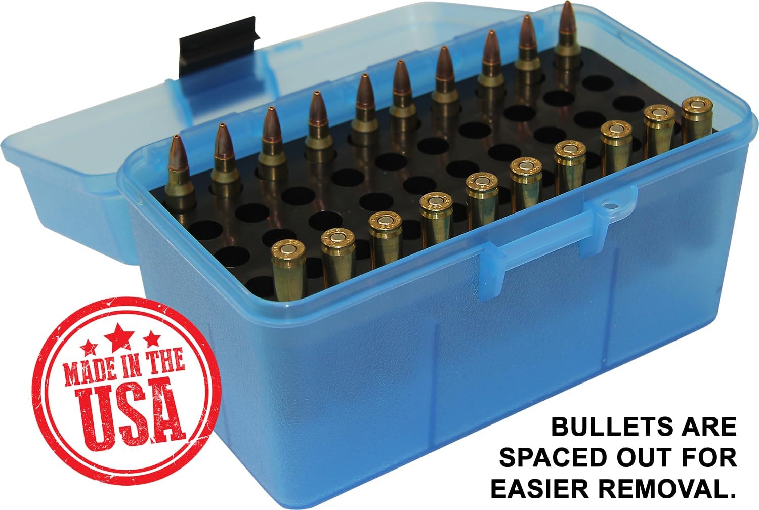 These deluxe 50 round ammo boxes were designed for the ultimate ammo protection and ease of transporting. Ideal ammunition storage for competitive shooters, varmint hunters and precision reloaders. Bullets are placed in the box in the down position and are protected by four special fingers. These fingers are designed to keep most bullet tips from hitting the bottom of the box, preventing tip damage that can change bullet flight characteristics. There is also extra space provided between rounds to facilitate easy removal. Stackable design and has generously proportioned handle for easy carrying. The case has a scuff resistant textured finish and a strong full length hinge. Made out of Polypropylene, that won't crack, chip, contract, expand or warp. TSA compliant. 10 year guarantee and comes with a pressure sensitive load label for recording load data.Calibers are list bullet up.H50-RS holds: 17 Fireball, 17 Rem., 20 Tactical, 204 Ruger, 221 Rem., 222 Rem. Mag., 223 Rem., 223 Rem. HP, 25-20 Win., 300 Sherwood, 300 Whisper, 32 Ideal, 6mm TCU, 6mm-223 Rem, 6x47. Bullet UP Max. OAL= 2.37""Bullet DOWN Max. OAL= 3.45""All MTM Case-Gard's are MADE IN USA in their factory in Dayton Ohio.