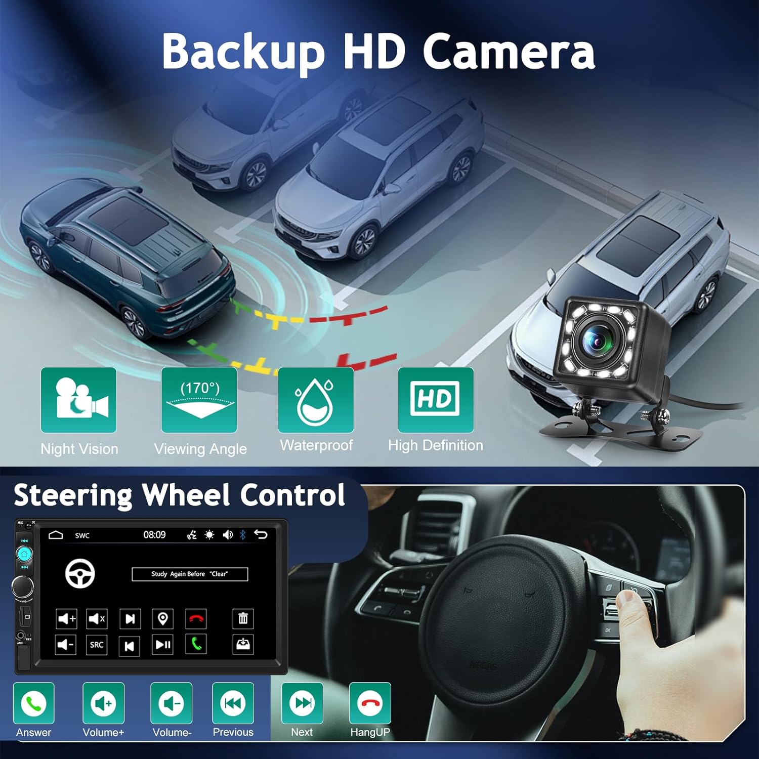 | BuiltIn Media | backup camera, double din car stereo, horn cable, power cable, user manual |