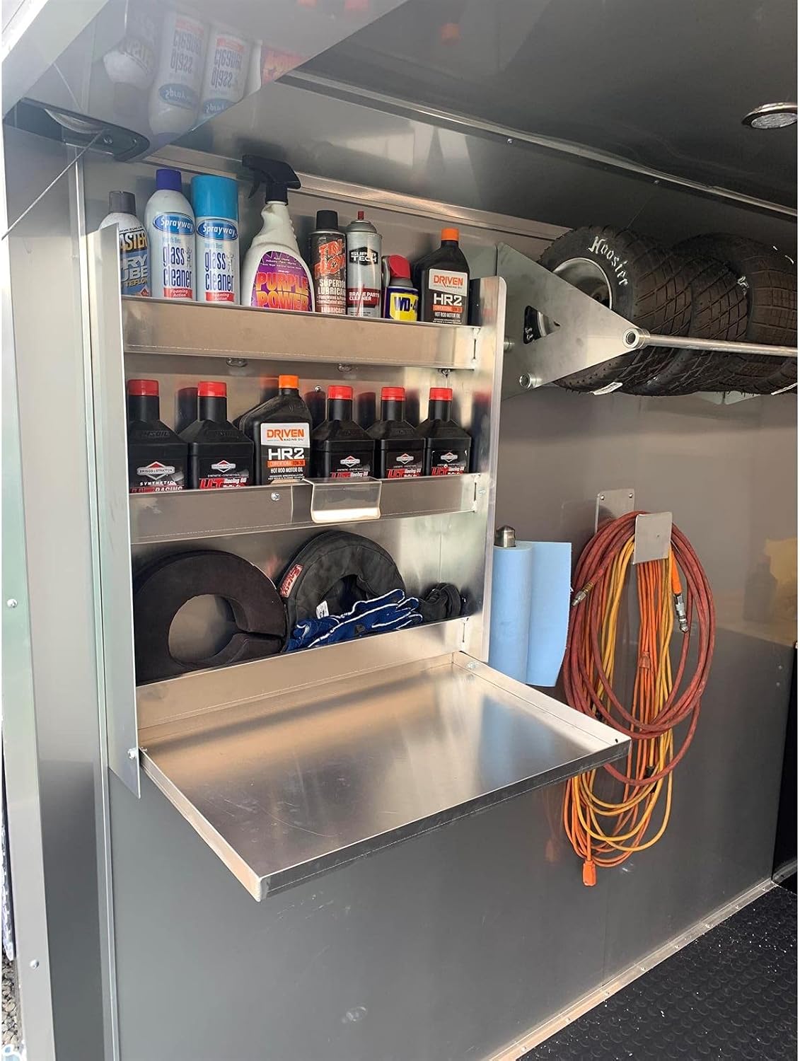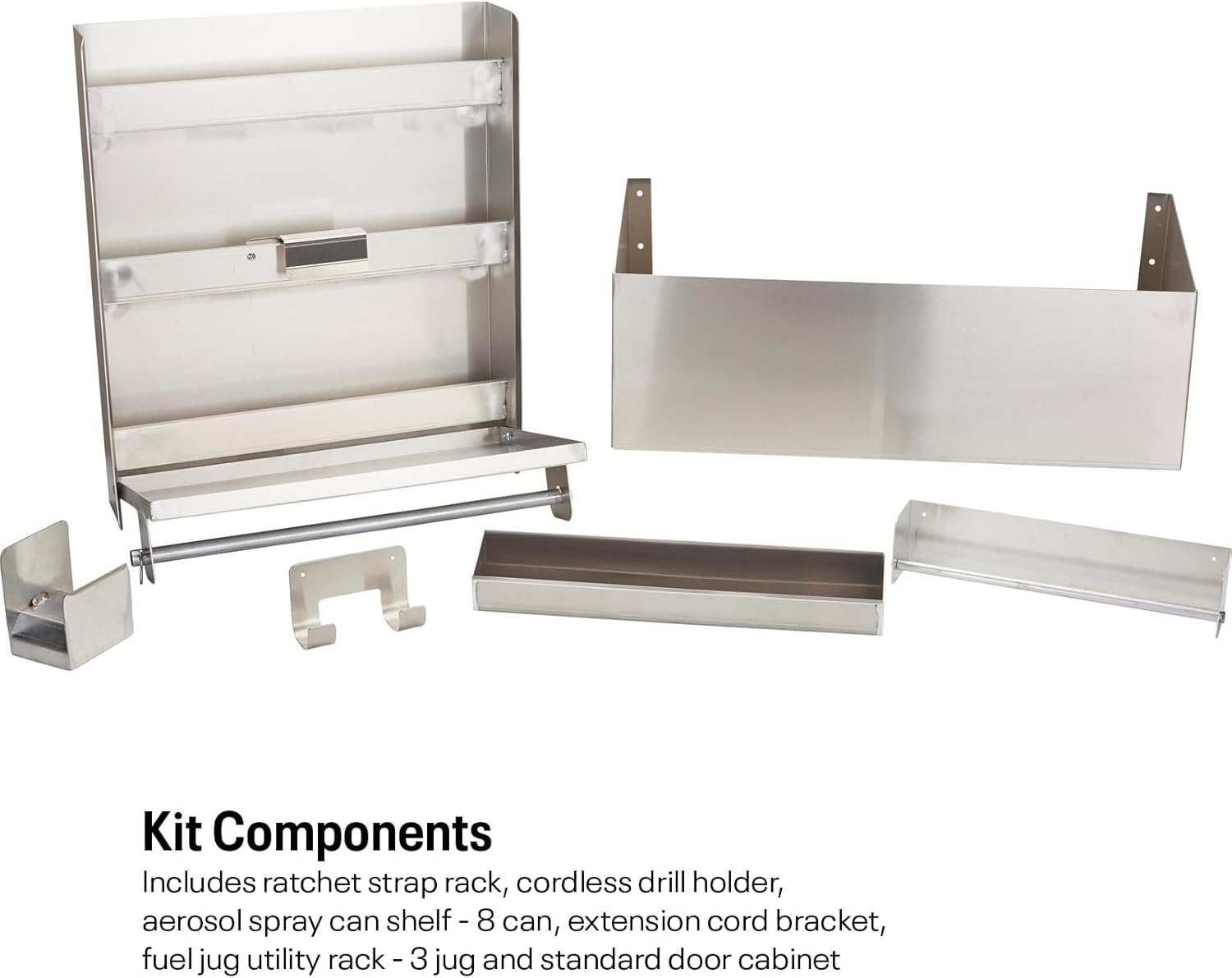 | Included Components | Ratchet Strap Rack, Cordless Drill Holder, Aerosol Spray Can Shelf, Extension Cord Bracket, Fuel Jug Utility Rack, Standard Door Cabinet |