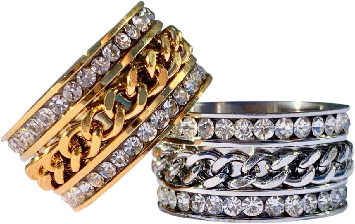 Striking double cubic zirconia eternity bands with manual spinner chain! Unique style that is sure to make a statement, not to mention fun for fidgeting! Very sparkly and fun at the same time. Who doesn't want a pretty ring they can also play with? Perfect unique gift for any mom, grandma, girlfriend, wife, daughter, friend, anyone! All our rings are made of the highest quality stainless steel available. Stainless steel is very durable, and will not rust or turn colors. The clear crystals are cubic zirconia, and are channel set. They wrap all the way around the ring for a simple and elegant look. Not sure what size to get, or not sure if she would wear a ring? Get a cute chain to hang the rings from! Check out our other listings to see our stainless steel chains, a perfect compliment to our rings. All of our rings are available in whole sizes 5-11. Please keep in mind when ordering...these rings are approx. 11 mm wide, so they will run about 1 size smaller than your usual ring size. IT IS BEST TO ORDER 1 SIZE LARGER TO ENSURE PROPER FIT. If you prefer gold, please see our other listing. Gift wrapping services included, receive a free adorable organza gift bag with every ring ordered! ;-)