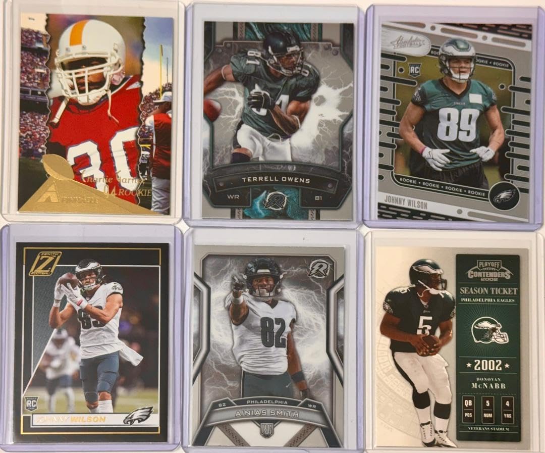 This exceptional sports card collection features Philadelphia Eagles legends and rising stars. The centerpiece is a PSA-graded 1988 Topps card (#234) in VG-EX 4 condition with an authenticated AUTO grade of 7, showcasing the Eagles' dynamic quarterback from the late 80s. The card's reverse details impressive stats, including multiple touchdown passes in 8 of 12 games played in 1987, with 2,786 passing yards and 23 touchdowns that season. This collection also includes rookie cards of notable Eagles players like Johnny Wilson and Ainias Smith, plus cards featuring franchise stars Terrell Owens and Charlie Garner. A special 2002 season ticket card of Eagles quarterback McNabb adds unique variety to this Philadelphia-focused collection. Each card captures key moments in Eagles history, making this set particularly appealing to team collectors and NFL memorabilia enthusiasts. The professional grading ensures authenticity and provides confidence in the collection's condition and value.