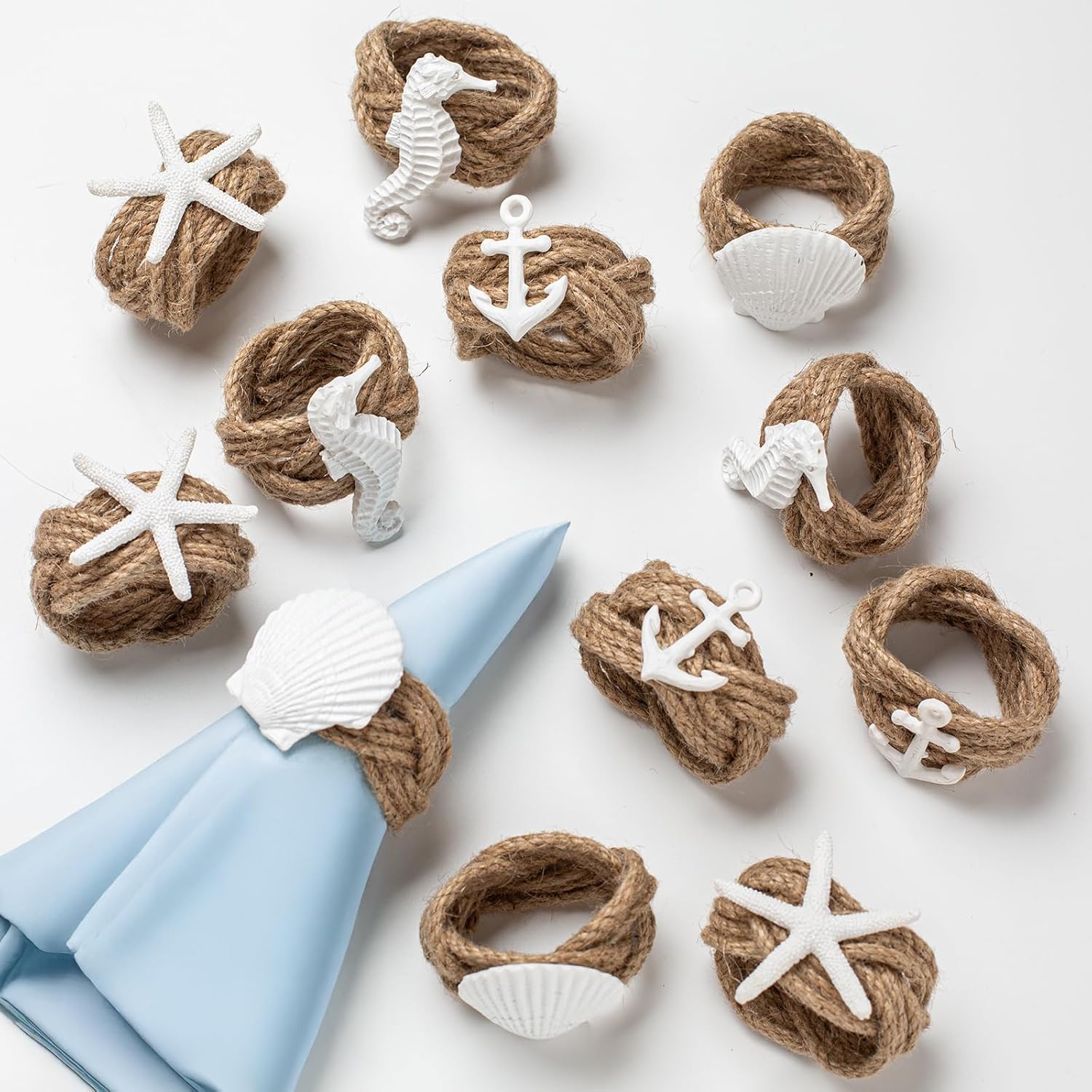Coastal napkin rings set of 12 There are four styles, namely starfish, seahorse, anchor and shell. Each style comes with 3 napkin rings Size: The inner diameter of the ring is approximately 1.57 inches All handmade: These white ocean style napkin rings are made of thick hemp rope and resin, each one is handmade, unique, cute, sturdy, full of rustic, boho, coastal style Coastal napkin rings: These ocean themed napkin ring holders are perfect for beach themed wedding receptions, family gatherings, anniversaries, dinner parties, birthday parties, beach themed parties, banquets, or just everyday home table decorations. Suitable occasion: Whether you are setting the table for picnic, party, wedding or any other occasion, these napkin rings are suitable for entertaining guests and giving gifts. They are suitable for formal dinners or as everyday napkin rings, which complement delicious dishes. Notes: The color may exist a slight difference due to different screen displays.