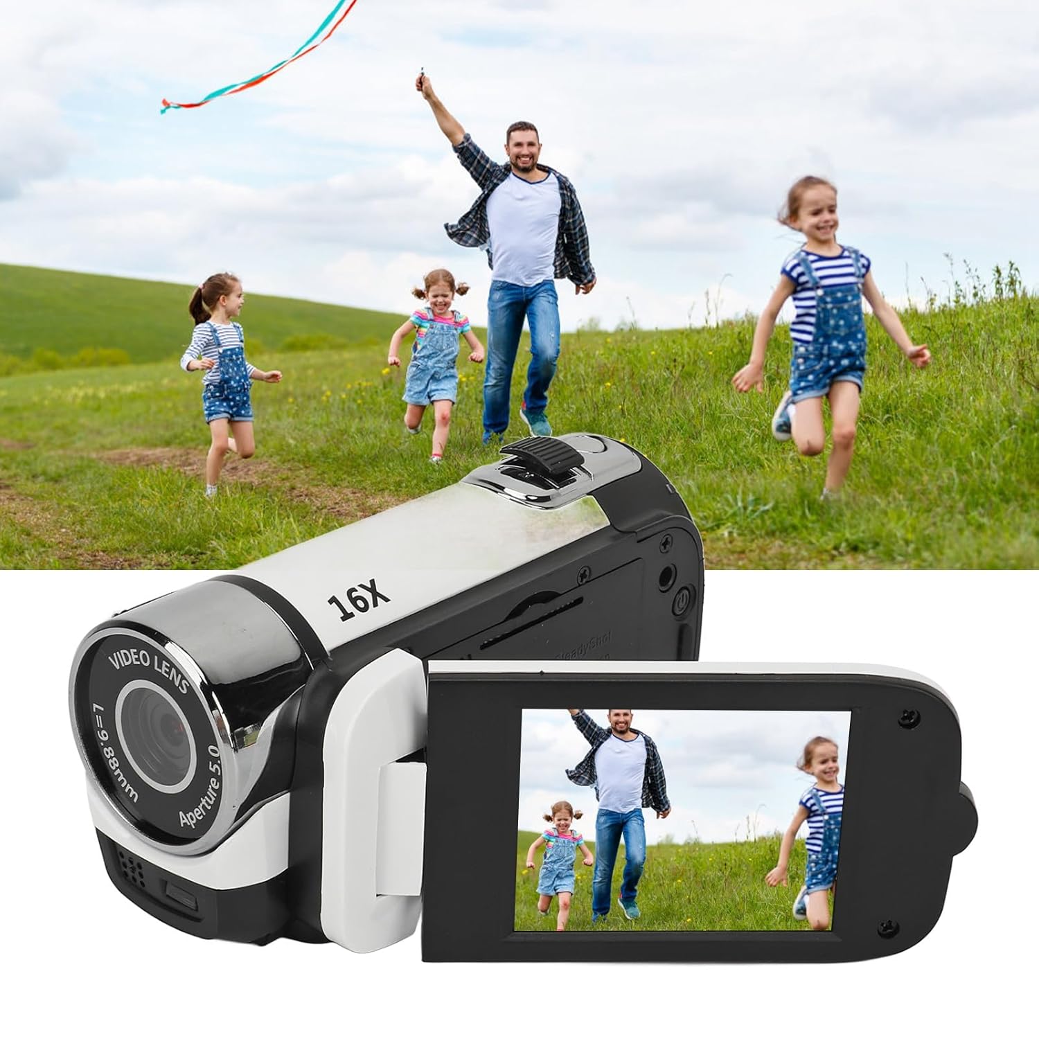1. Camera Parameter: This digital camera has 2.4 inch rotatable screen, 1080P video resolution, 16X digital zoom, 16MP pixels, HD output, supports recording while charging. 2. With Fill Light: The front of this digital camera is equipped with fill light, which is convenient for photography, and can be used in various environments, day or night. 3. Multiple Functions: Supports selfies, electronic anti shake, loop recording, time watermarking, and other functions, supports external microphone, and thoughtful recording pause. 4. USB Connection: This camera is equipped with USB port, connect to the computer by USB cable to view photos and videos, the bottom 1/4 inch thread hole can connect to a tripod (not included). 5. Applicable Scene: This video recorder supports a maximum of standard 32GB memory card (not included), and suitable for baby growth recording, travel, wedding, campus records, etc. Specification: Item Type: 16MP Digital Camera Material: ABS Image Resolution: 1MP, 2MP, 3MP, 5MP, 8MP, 10MP, 12MP, 16MP Image Format: JPG Video Resolution: 1080P (maximum) Video Format: AVI Screen Size: 2.4 Inch Digital Zoom: 16X Shutter: Electronic Storage: Supports up to 32GB standard memory card (not included) Camera Battery: 1 x BL-5C Lithium Battery, 600mAh (built in) Number of Language: 17 Languages How to Use: Insert the storage card, turn on the screen, press the power for 2‑3 seconds to start the machine. PackageList: 1 x Video Recorder 1 x Charging Cable 1 x User Manual