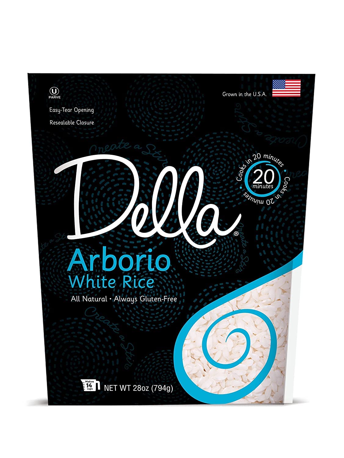 Stir up your culinary imagination with Della Gourmet Rice! Our All Natural, non-GMO, gluten free, Jasmine White Rice is grown right here in the USA. Each 28 oz. bag is freshly packed with an easy-tear opening and resealable closure, so you get the best taste and texture every time you cook it, and cooks in just 20 minutes! Our rice is low fat, sodium free, cholesterol free and OU Kosher, making it ideal for many special diets, sufferers of food allergies, and for potlucks or other gatherings. Read more