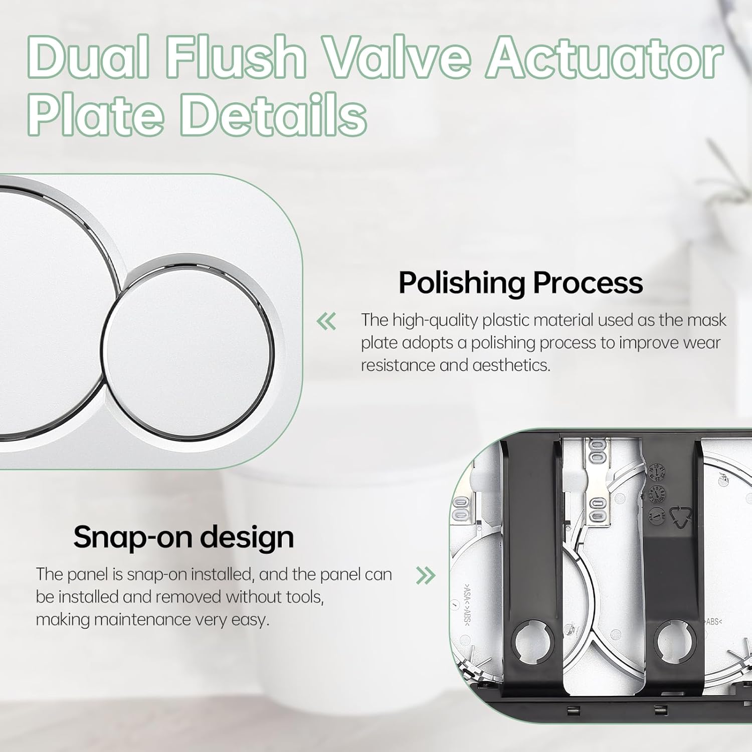 Believe you are looking for an Actuator Plate that is compatible with Geberit Dual-Flush. Our Actuator Plate just meets your needs! ! ! Product Name: Actuator Plate Product Size: 9.7*6.5*0.5in Product Packaging: 11.42*6.69*1.77in Product Color: Alpine white, Polished Chrome, Matte Chrome, Matte Black Introducing the compatible with Geberit 115.770.JQ.5 actuator plate, a premium flush actuator plate that combines functionality, durability and style. This actuator board is made of high-quality durable plastic and is built to last. Its chrome finish technology not only enhances its visual appeal but also provides an anti-fingerprint surface, ensuring it stays clean and shiny with ease. The sleek design blends seamlessly into any bathroom décor, adding a touch of modern elegance. Easy to install, professionals and DIY enthusiasts alike can set it up with ease. The large flush actuator plate opening is removable for easy operation. Choose this compatible actuator board for the perfect blend of style, efficiency and reliability. Designed to meet the highest standards of performance and durability, this premium actuator plate enhances the functionality and aesthetics of your bathroom. Package Contains: Includes mounting frame and hardware