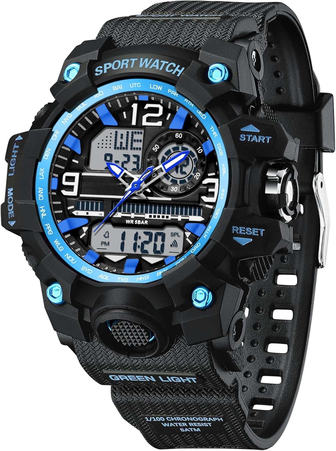 *Sports watches for women with multiple colors,outdoor and casual style watch,very suitable for any outfit and any occasion,great gift for ladies. *SPECIFICATION: - Shockproof - Dual Time Display - Calendar - LED Backlight - 12/24H - Stopwatch - Alarm - 5ATM Waterproof Case Material:ABS Band Material:TPU Buckle Material:Stainless Steel Mirror:Acrylic Dial Case Diameter:45mm(1.77") Dial Case Thickness:16mm (0.63") Band Width:18-22mm(0.71"-0.86") Band Length:215mm(8.46") Wear Perimeter:135-195mm(5.31"-7.67") Weight:43g *NOTES: - Waterproof:Daily water resistant. - DO NOT suitable for hot water bathing,diving,water-related work.Please DO NOT press any buttons underwater. *PACKAGE INCLUDED: - 1*Watch - 1*Manual - 1*Watch Box *Any questions,please kindly contact us,we would always offer best solution to you.