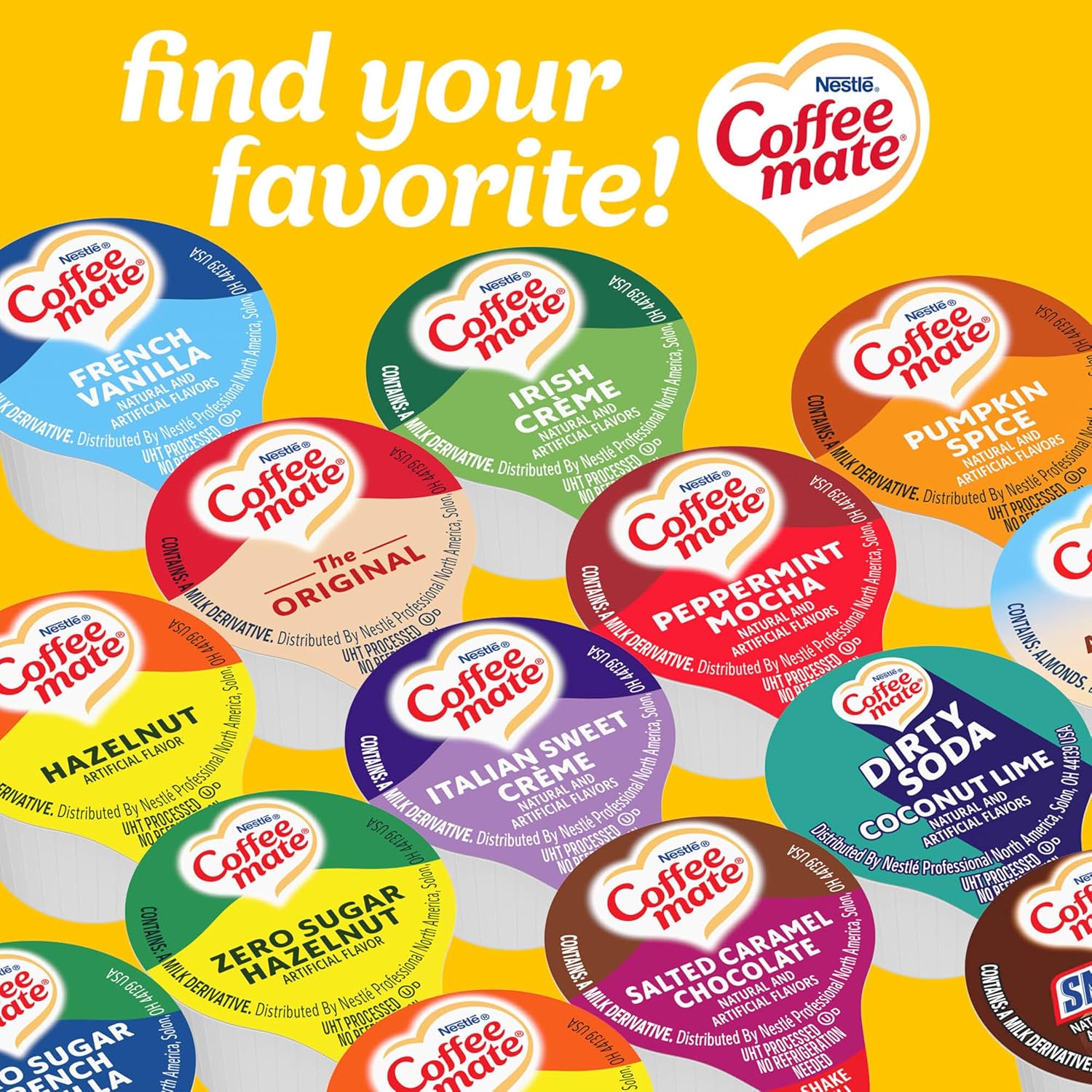 Nestle Coffee mate Hazelnut flavored liquid creamer singles are a crowd pleaser. Within each cup is a harmonious blend between a deliciously rich, velvety smooth classic and sweet nutty hazelnut notes that will enhance and enrich your coffee offer with a touch of differentiation. Packaged in a 180 count box, these are the perfect solution for a delicious and convenient option to customize your favorite beverage. These creamer singles don’t need to be refrigerated, and can retain their irresistible flavor at room temperature for up to 9 months. Easy to use - shake, open and pour. Non-Dairy + Lactose-Free + Cholesterol-Free + Gluten-Free + Kosher Dairy. Coffee mate is America's #1 coffee creamer. With a variety of flavors and formats, Coffee mate has your coffee creamer needs covered. Delight your employees, customers and guests by offering Coffee mate liquid creamer in your workplace, break room or kitchen. Covered by the Nestlé Professional 60-Day Satisfaction Guarantee for Select Products. See below for details.