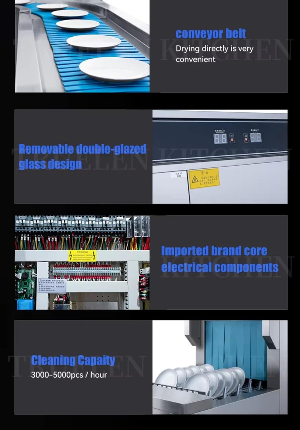 This high-capacity commercial dishwasher is engineered for professional restaurant environments, featuring a robust stainless steel construction and advanced operational functionalities. Incorporating intelligent power circulating pump technology and curved spray arms, it ensures comprehensive cleaning coverage across all areas of the chamber. The system maintains optimal washing (55–65°C) and rinsing (82–90°C) temperatures to guarantee hygiene and operational efficiency. Its durable design includes a removable three-layer filtration system and high-reliability electrical switch components, supporting sustained performance and ease of maintenance. 1. Versatile cleaning capability: Can handle various tableware like 18cm vegetable dishes, 6.5cm tea cups, 13cm rice bowls, and 26cm dining trays. 2. Efficient washing capacity: Each rack can wash 15-30 vegetable dishes, 50 tea cups, 50 rice bowls, or 16 dining trays, meeting different cleaning needs. 3. Intelligent and visual design: Features an intelligent button screen for temperature control and a visual window to check dish cleaning status easily. 4.Practical structural details: Equipped with a residue isolation net to prevent blockage and a convenient stainless steel lid handle for easy operation. As a professional commercial dishwasher manufacturer, we offer OEM/ODM customization options to fit your specific needs. Contact us directly via WhatsApp +86 13607655179 for personalized support, and enjoy our reliable after-sales service—ensuring a smooth purchasing experience from factory to your restaurant.