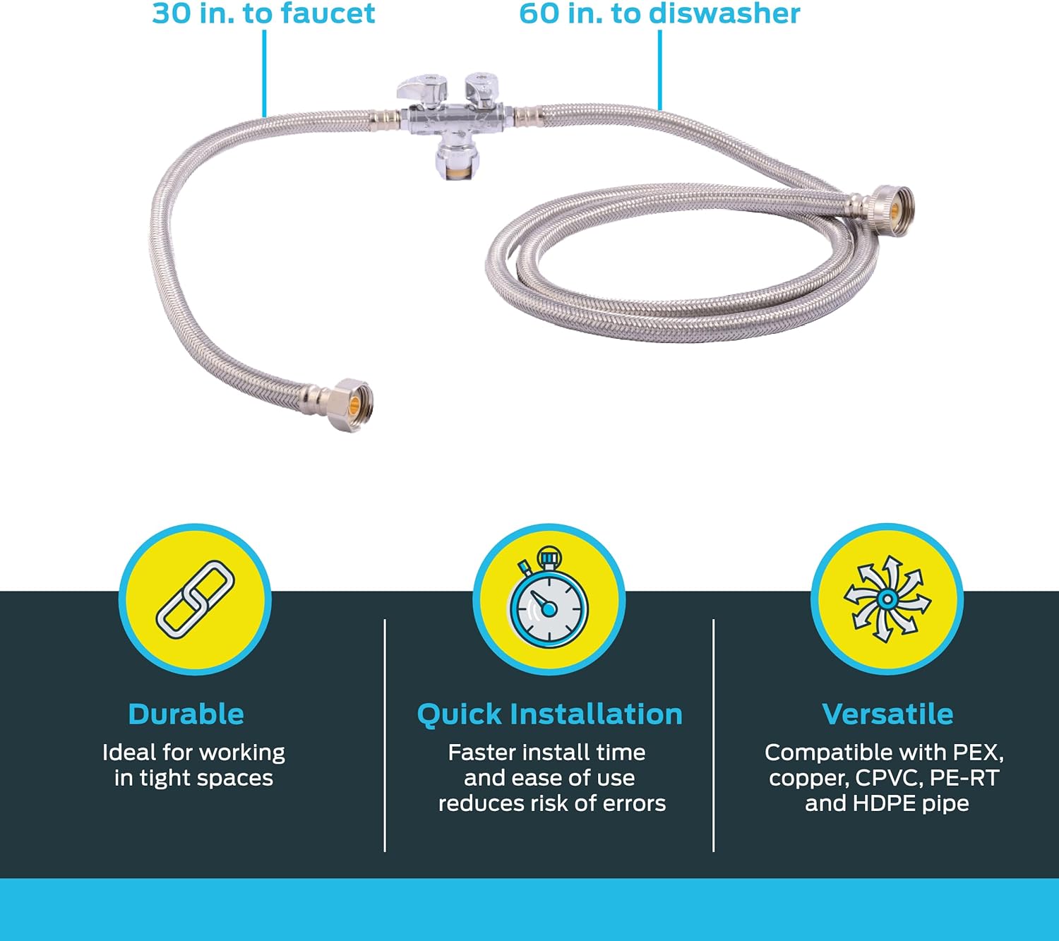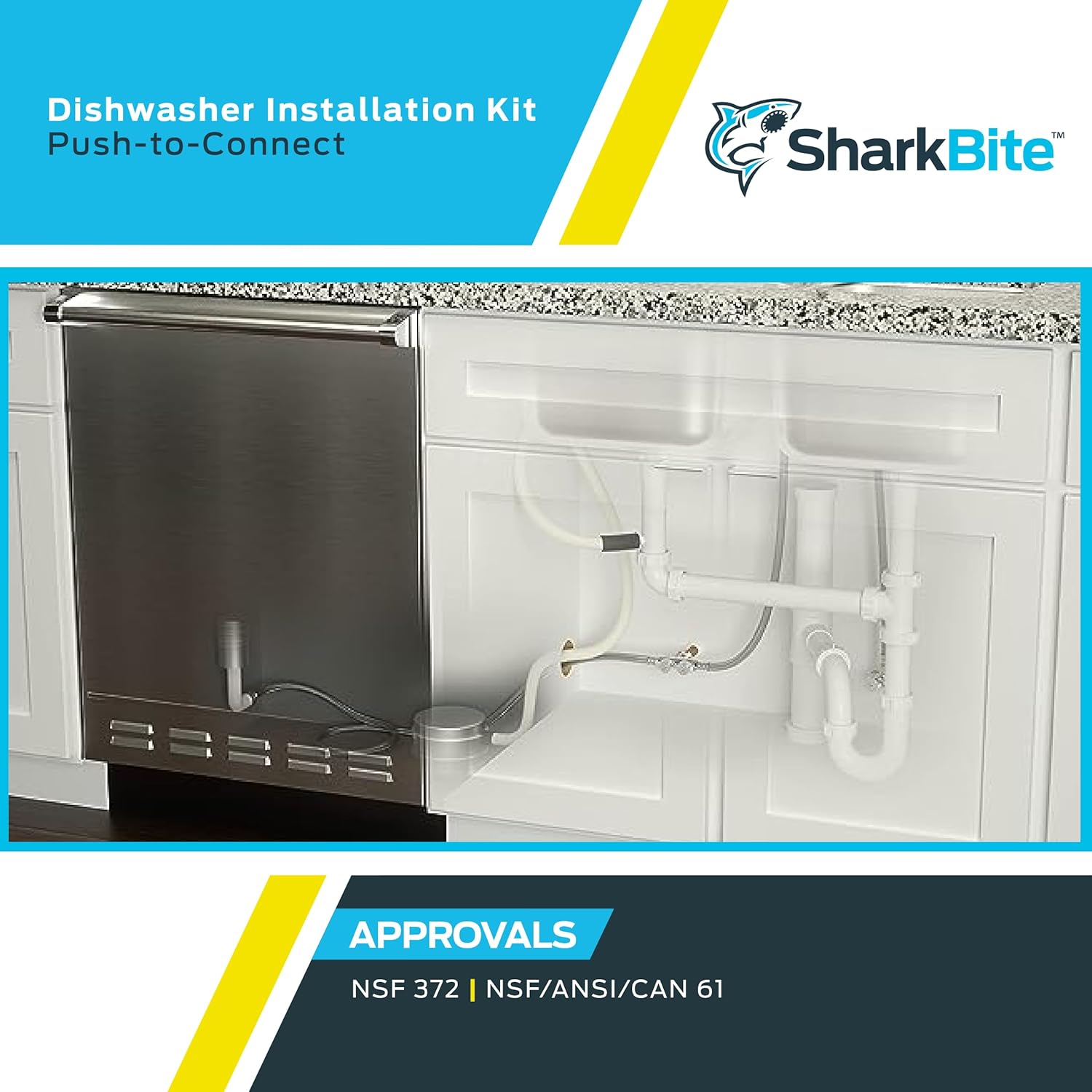 Easily install or repair your dishwasher supply lines with the SharkBite faucet hose kit. The PEX faucet fittings feature a push-to-connect design which allows for quick and easy installation and does not require any tools, glue, crimping, or soldering. Composed of brass for durability and reliability, this faucet supply valve kit can be easily rotated on a pipe after installation for use in tight spaces and is compatible with any combination of copper, PEX, CPVC, or PE-RT pipes.